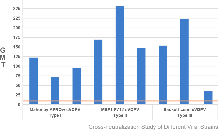 Sabin IPV can induce protective antibodies against all epidemic wild polio virus strains and most VDPV strains. The GMT are all significantly higher than protective level (GMT>8).